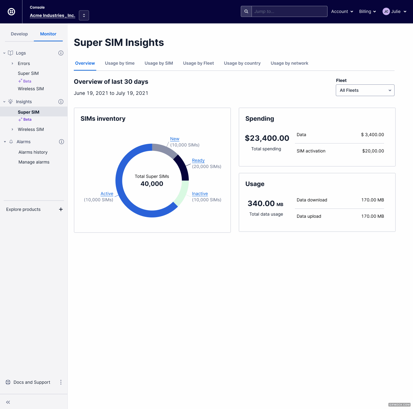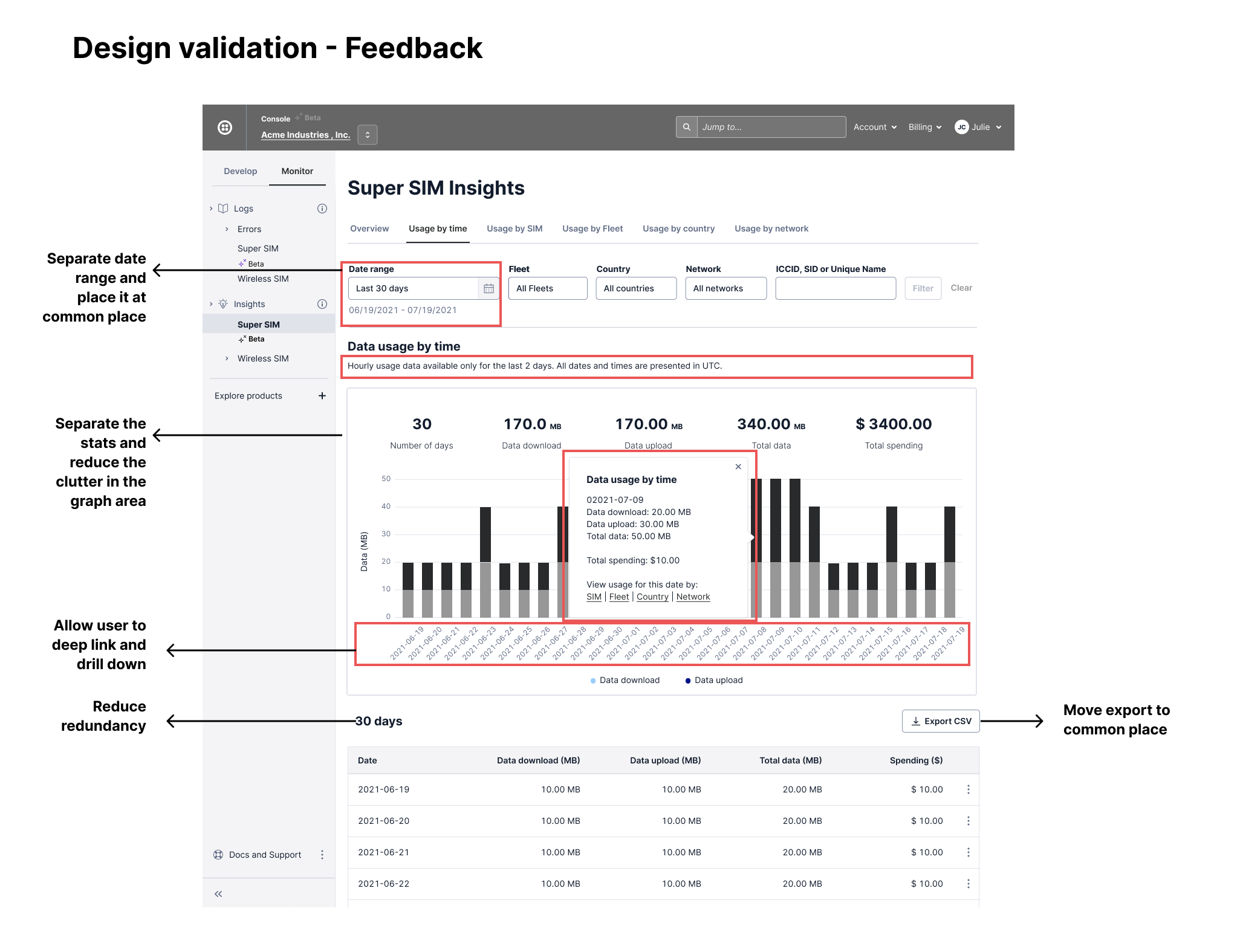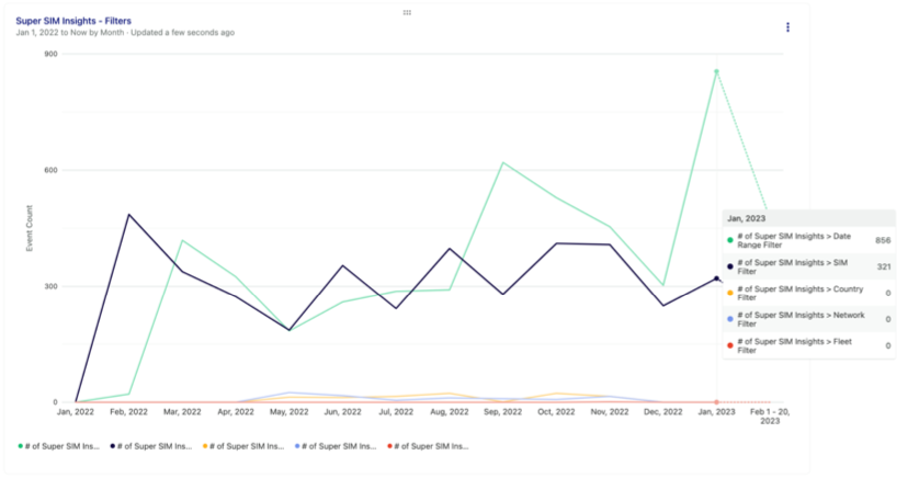 Design a Report/Insights feature that allows Super SIM’s customers to review their usage data overtime and manage trends in their SIM’s activities by slicing and dicing their data using various filters.