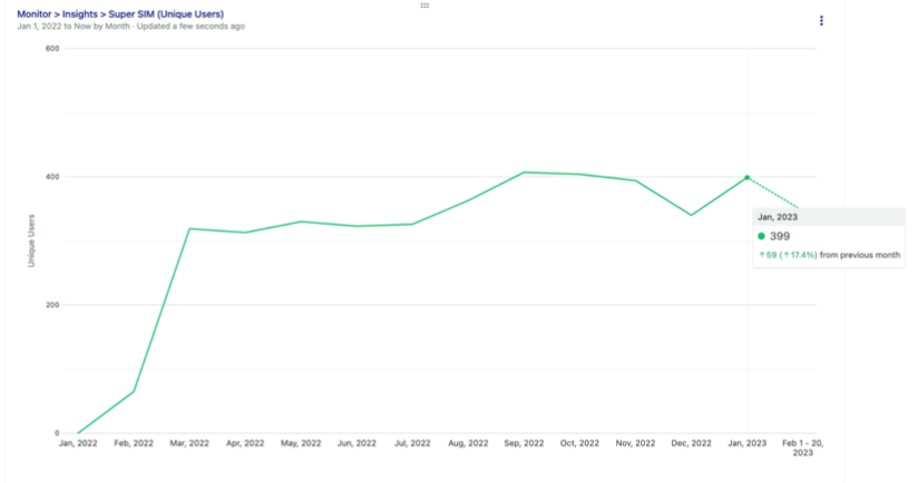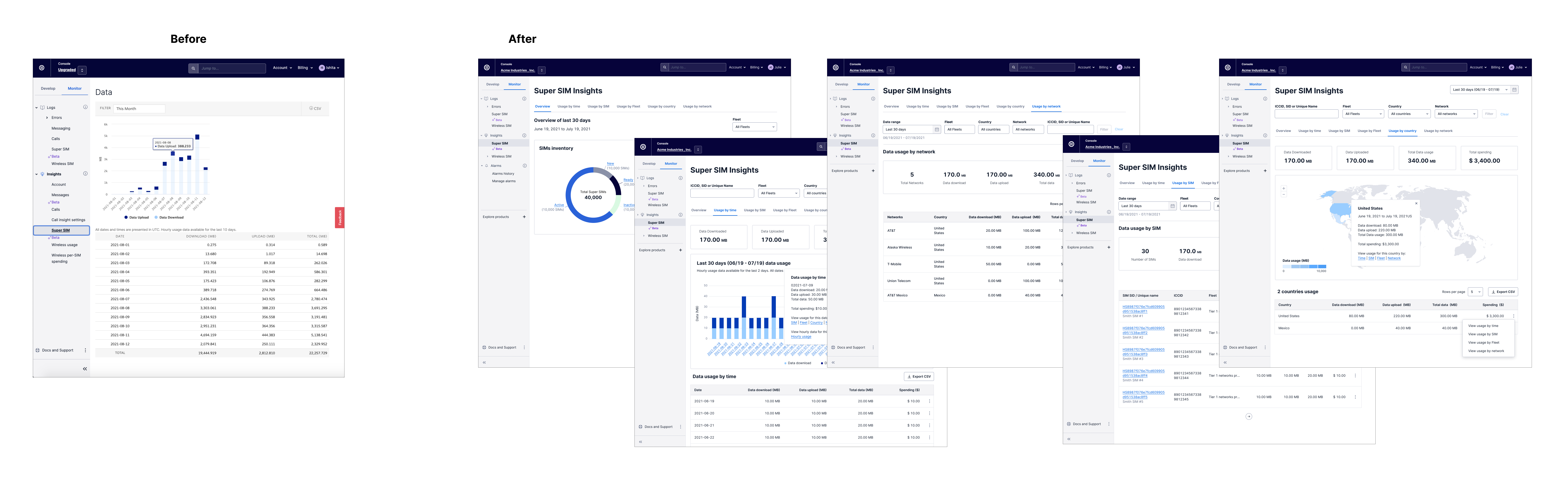 The current UI solution of the web application displayed only basic reporting on account-aggregated Super SIM usage. An alternative solution required users to integrate with the API, leading to user frustration due to limited access to their own data. As a result, users experienced difficulties resolving issues and had to seek assistance from the support team by opening support tickets. The IoT customer support team received an average of 80 support tickets per month related to their Super SIMs usage inquiries.